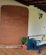 a cobertura ocorre por telhado cerâmica e na varanda madeiramento tratado; banheiro está equipado com box e armários; as janelas são grandes em arco/arredondadas e de madeira o que favorecem a iluminação natural aos ambientes, o estilo diferenciado promovem elegância e sofisticação na fachada da casa;